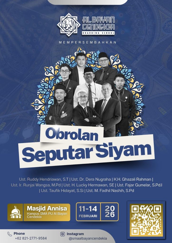 Kegiatan OBSESI (Obrolan Seputar Siyam) tahun ini berlangsung dengan penuh semangat dan antusiasme dari para siswa siswi. Sejak hari pertama, suasana sudah terasa hangat dan hidup. Pada sesi pembuka, siswa siswi mendapatkan materi bertema “Sains vs Syariat: Mengapa Puasa Kita Berbeda Hari?” yang disampaikan oleh Bapak Ust. Ruddy Hendriawan, S.T., Kepala SMA PU Al Bayan Cendekia. Materi ini mengajak siswa melihat perbedaan penentuan awal Ramadan dari dua sudut pandang—ilmu pengetahuan dan syariat Islam—sehingga mereka belajar untuk bersikap bijak, terbuka, dan saling menghargai di tengah perbedaan. Sesi berikutnya menghadirkan Bapak Ust. Dr. Dera Nugraha dengan tema “Ramadan Core: Menemukan Jati Diri di Balik Lapar.” Dalam pemaparannya, siswa siswi diajak memahami bahwa puasa bukan sekadar menahan lapar dan haus, tetapi juga proses pembentukan karakter berupa melatih kesabaran, pengendalian diri, serta memperkuat hubungan dengan Allah SWT.