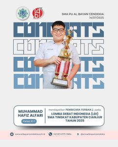 Siswa SMA Al Bayan Cendekia Cianjur berhasil menjuarai Lomba Debat Bahasa Indonesia (LDBI) yang diselenggarakan oleh Musyawarah Guru Mata Pelajaran (MGMP) Bahasa Indonesia Kabupaten Cianjur pada 19 Juli 2025 yang lalu.